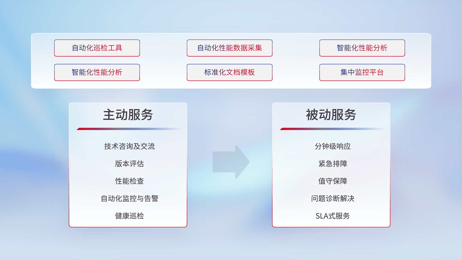智能化工具和标准化文档,,,保障服务质量,,,提供主动服务(包含技术咨询、、、版本评估、、、性能检查、、自动化监控与告警、、健康巡检)和被动服务包含(分钟级响应、、、、紧急排障、、、、值守保障、、问题诊断解决、、SLA服务)。。。